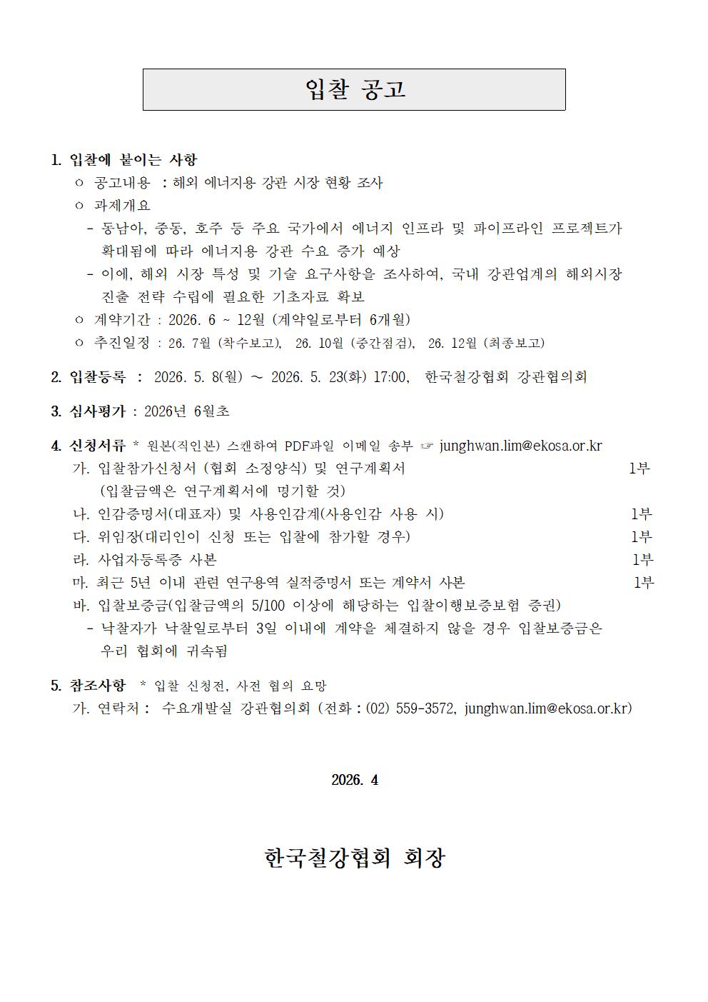 해외 에너지용 강관 시장 현황 조사 입찰공고 관리자 2026-04-17 13:45:18 view : 29 첨부 notice.hwp (26K) attach.hwp (89K) 목록 이전글일본 내진용강관 시장 및 활성화 방안 조사 입찰공고2026.04.17 다음글국내외 강관설비 메이커 기술 세미나 개최 (5. 29)2026.04.16