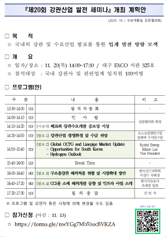 제20회 강관산업 발전 세미나 개최 (참석 요청) 관리자 2025-10-17 15:34:46 view : 14 목록 다음글[재입찰공고] 천연수소 개발 및 시장 현황 조사 입찰 2025.09.29